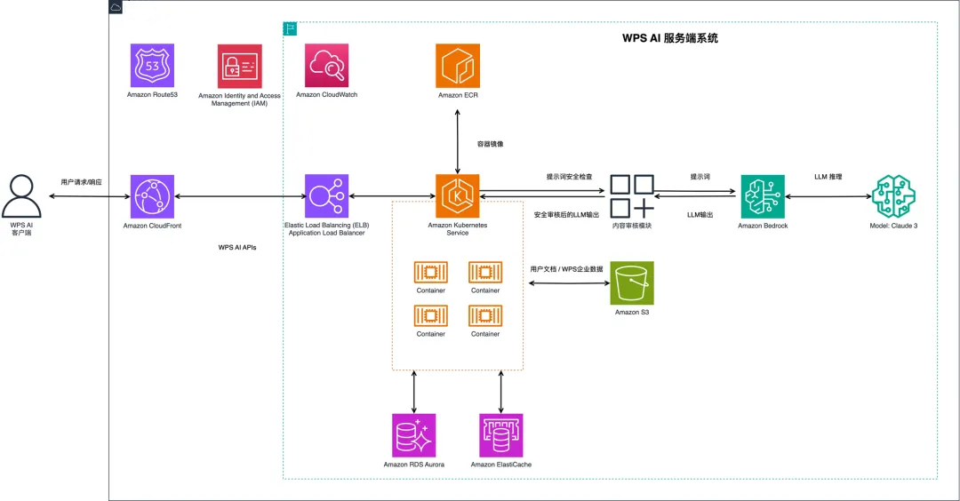 金山办公目前使用的亚马逊云科技产品包括:Amazon Bedrock、Amazon Elastic Kubernetes Service (Amazon EKS)、Amazon CloudWatch、Amazon Simple Storage Service (Amazon S3)、Amazon Relational Database Service (Amazon RDS)、Amazon ElastiCache、Amazon Route53、Amazon Identity and Access Management (IAM) 等。