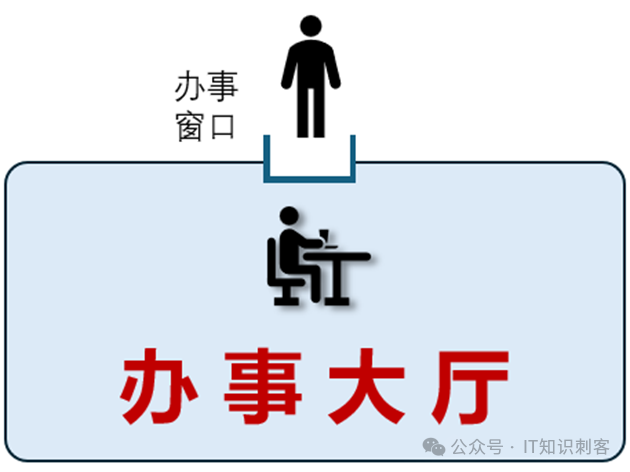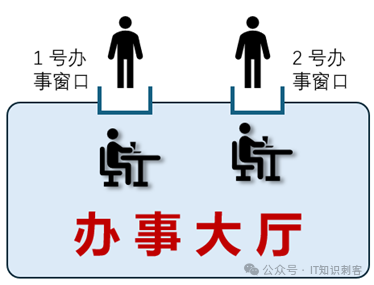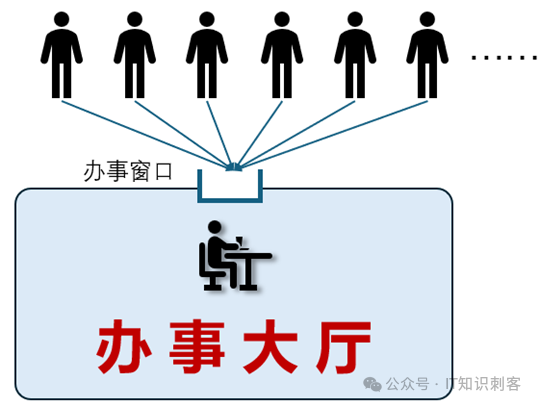 我把CPU中的“计算单元”等内部组件比作图1的办事大厅,办事大厅有个对外的窗口,大家排着队,在窗口这儿办事。注: