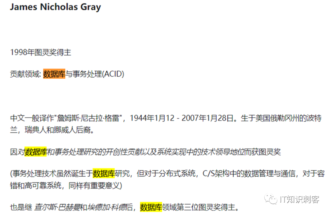 James Nicholas Gray,1998年获奖,贡献领域写明了,就是:数据库与事务处理(ACID)。