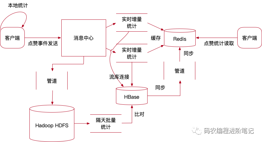 这样点赞总数总是来自当日总数和非当天统计总数之和,当日总数是实时增量的,不去理会是否正确,做好批量统计比对就一定能保证隔天以后点赞总数的准确性。如下图所示: