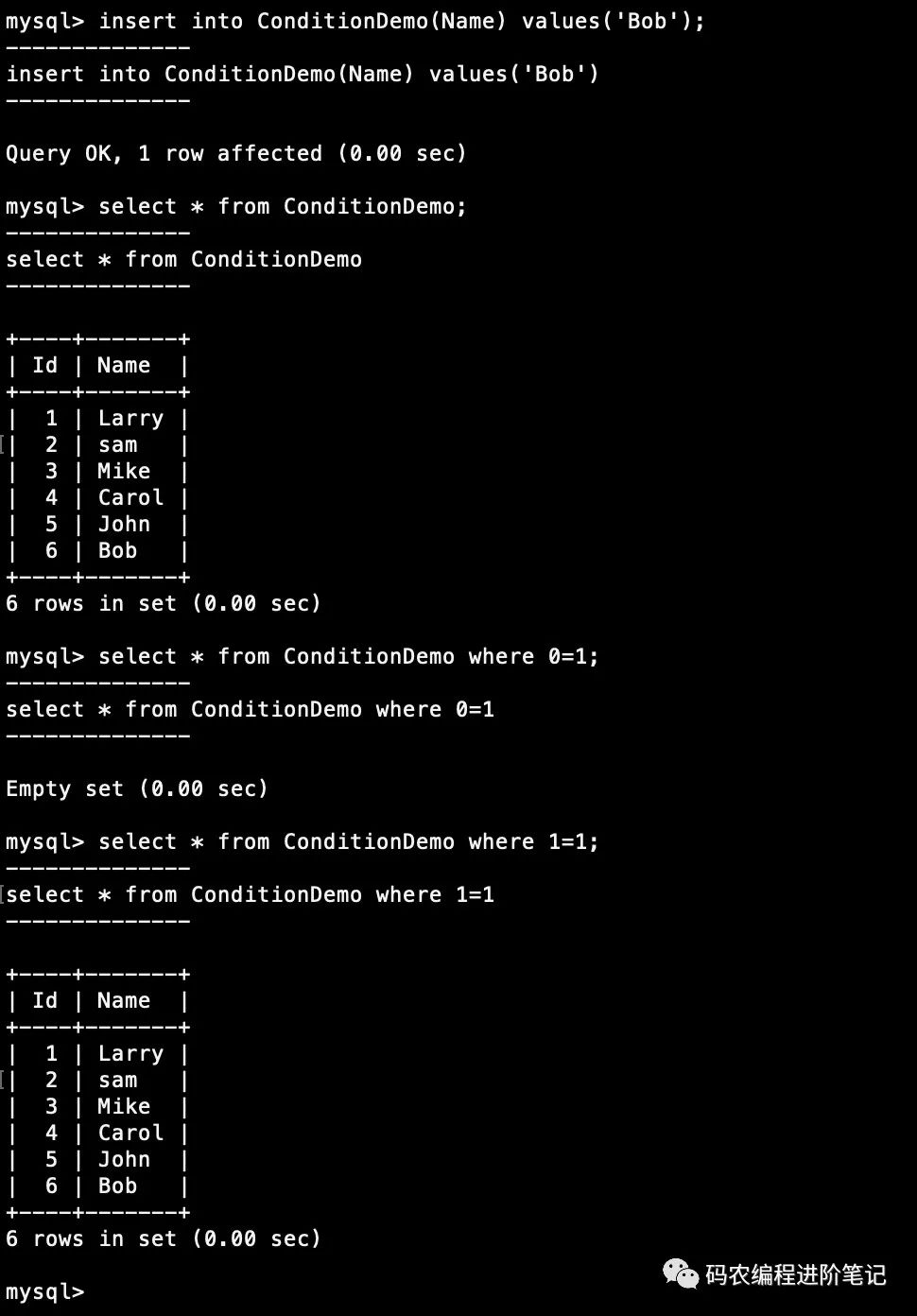 mysql> insert into ConditionDemo(Name) values('Bob');使用select语句显示表中的所有记录。查询如下: