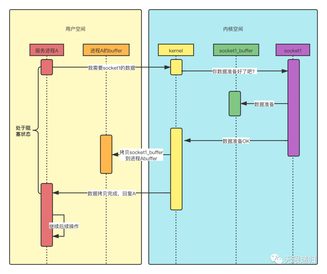 上图即为阻塞IO模型读取数据的时序图:线程A想要读socket1的数据,这时它发起系统调用,向kernel要数据,但是由于数据还没准备好,所以它发起读取请求后,就阻塞住了,直到数据准备好了,然后kernel把数据从socket1缓冲区拷贝到进程A的缓冲区后,才给进程A做出响应,然后进程A才能继续做后续操作。