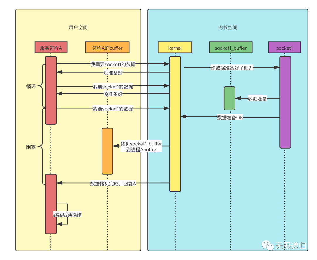 这个图呢就是非阻塞IO模型读取数据的时序图:从图中可以看出,与阻塞IO模型不同的是,当数据未准备好的时候,kernel会先返回给进程A一个消息,告诉它还没准备好,这时进程A就会搞一个while循环,一直在这里不停的问kernel数据好了没(在每次询问之间进程A还是可以做一点其他事情的,而不是像阻塞IO那样啥也不能做,就一直等着),直到数据准备好了,然后开始阻塞住,等待数据拷贝完成,kernel再回复进程A,进程A就可以处理数据了。这里的非阻塞是指发出要数据的请求后,kernel直接会给出一个数据还没准备好的答复,而不像阻塞IO那样,一个回音都没有。但是后面数据准备好了,在数据拷贝的过程中,进程A依然是阻塞的,要等到kernel拷贝好数据后给出答复再进行数据处理。