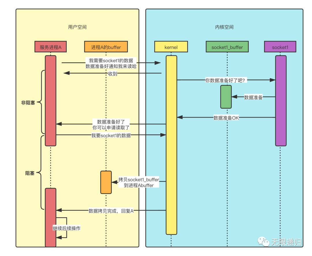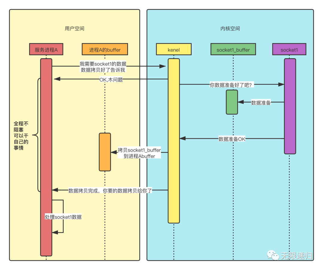 异步则是指在数据准备和数据拷贝过程中,进程A全程都不用关心,可以一直做别的事情,只需要等着kernel通知,然后进行数据处理就可以了。