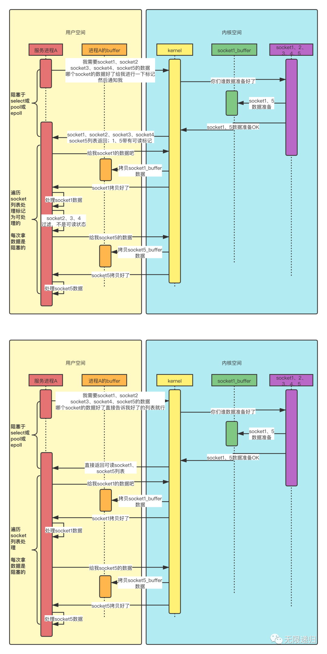 那这个图呢就是多路复用IO模型的时序图:为啥它画了两张呢?因为它的实现方式有这么几种:select、poll、epoll、kqueue。这里的两张图分别是select(也可以代表poll的)和epoll。我们需要好好看看这两张图与上面三种方式的不同之处。经过仔细对比,可以看出,两个图中,进程A一次向kernel要了好几个socket的数据,这就是多路,即一个进程可以实现对多个socket的监听。那么从图中我们可以看出select和epoll方式的不同之处在于kernel在返回socket列表时,select是返回的所有传入的socket,只是在这个socket列表中标记了哪些socket是可以处理的了,这样进程A就需要再遍历一遍所有的socket,然后只处理数据准备好的socket。而epoll的方式,kernel返回的socket列表就是所有的可以处理的socket了,进程A只需要遍历socket列表进行处理就可以了。poll方式与select方式相似,只是select监听的sockets个数是有限制的,而poll是没有限制的。从时序图中我们还可以看出,在处理socket的过程中,数据的拷贝过程还是会阻塞进程A的,只有数据拷贝完成后,进程A才能继续工作。