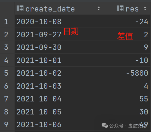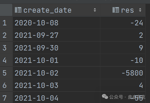 (2)按照销售日期create_date分组,计算商品1和商品2,每天的销量差值