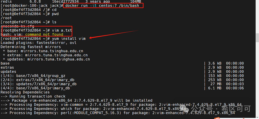 接着进入该容器,会发现容器实例里面没有 vim 指令,