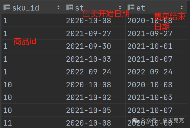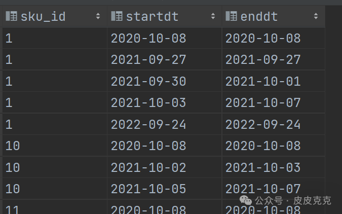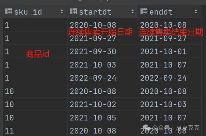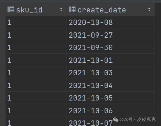 (3)如果存在连续日期,则连续的多个日期:create_date-rk 得出的结果一样。按照sku_id 和 这个差值分组即可
