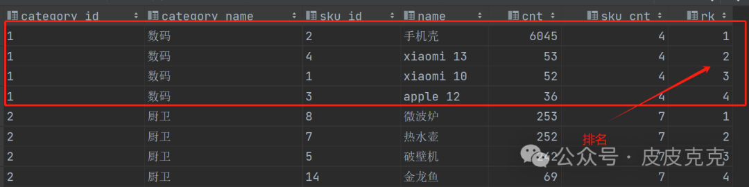 (4)筛选各个类别(category_id)销量(cnt)最高的(rk=1)的商品