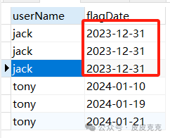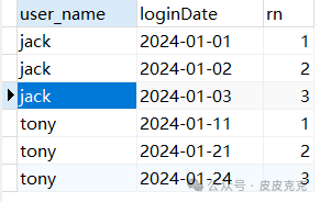 (3)最后,计算每个组内,相同 flagDate 的个数,大于等于3的,就是连续登录3天的用户了
