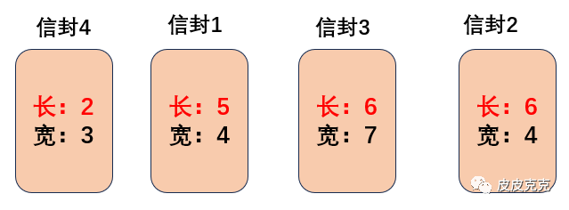 每个信封有长 和 宽,分别可以用 evelops[i][0] 和 evelops[i][1] 表示。