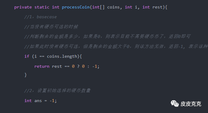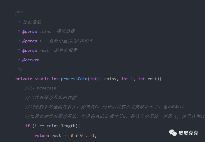 如果 i == coins.lenght ,表示越界了,也就是没有硬币可选了,判断剩余金额rest