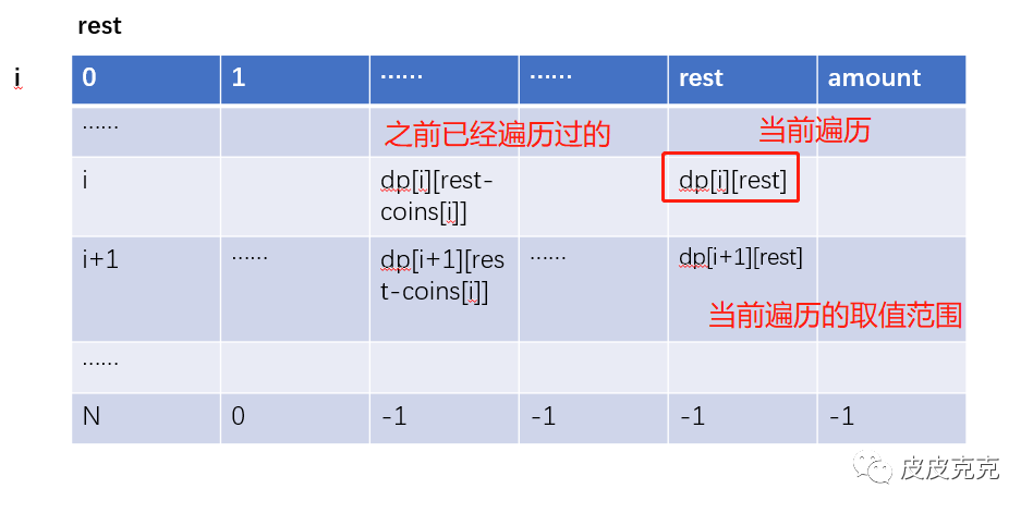 dp[i][rest - coins[i]] 的值,也是取决于下一行Min{dp[i+1][rest- n*coins[i]]}
