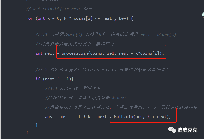就是 dp[i][rest] 取值是取决于 Min{dp[i+1][rest- n*coins[i]]},