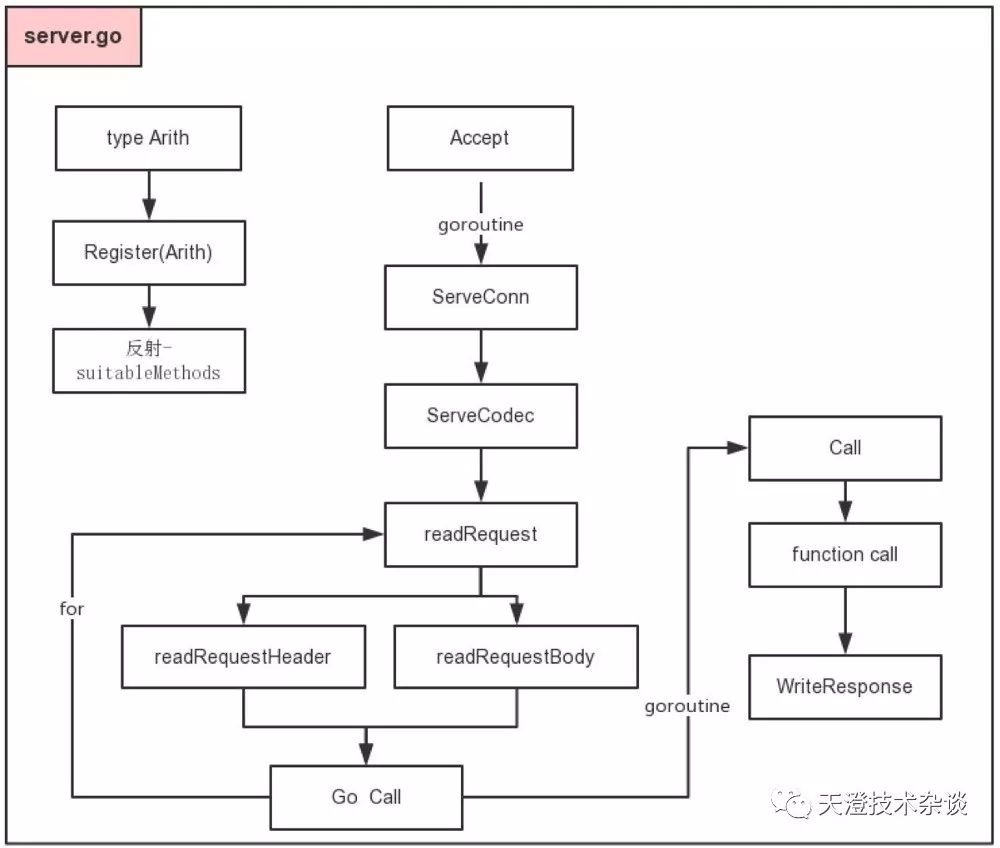 最终存储到server的serviceMap中。 客户端调用服务器的方法的结构为 struct.method,这样只需要按 . 进行分割,拿到struct名称和method名称则可以通过再serviceMap获取到方法,执行获得结果。