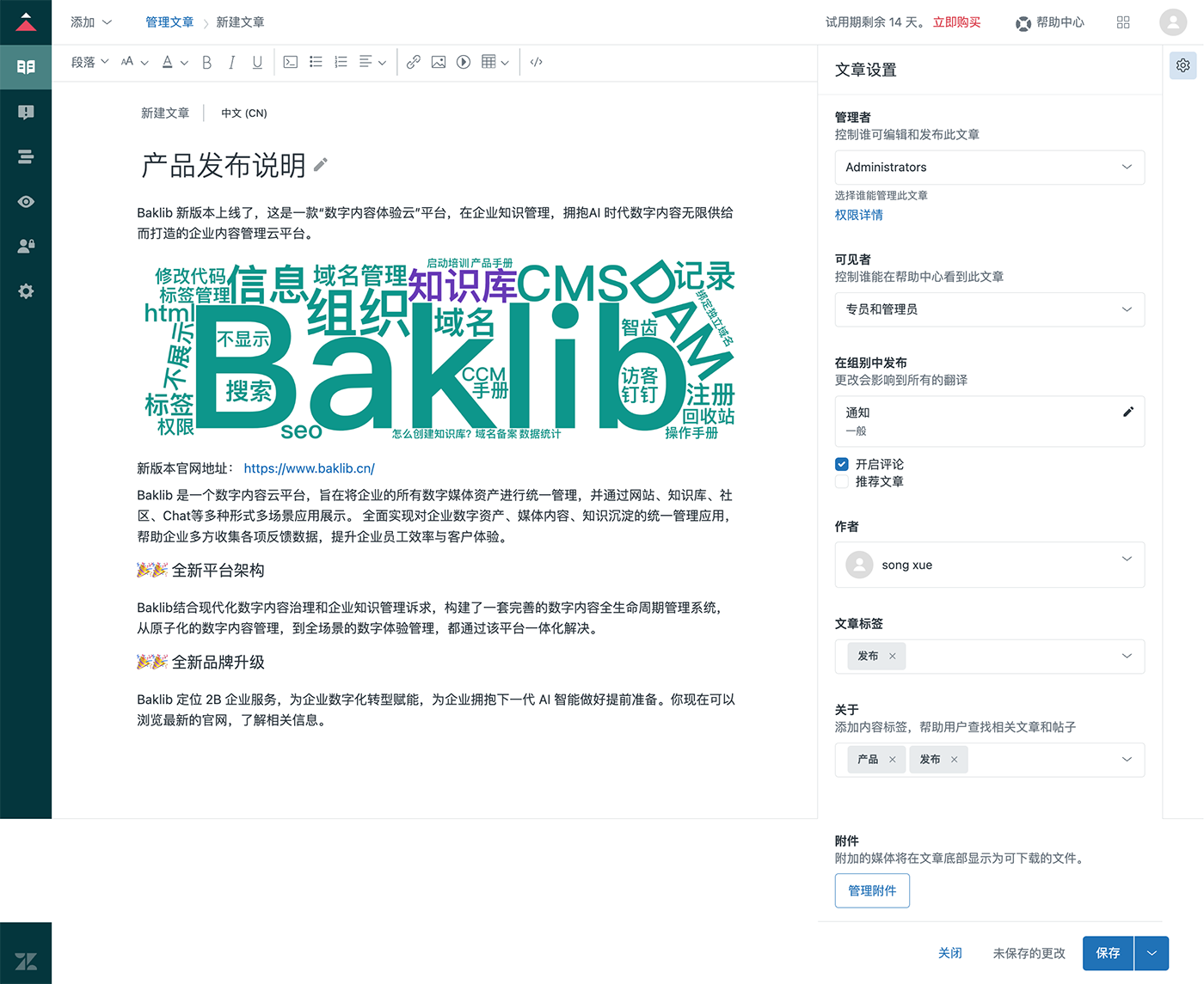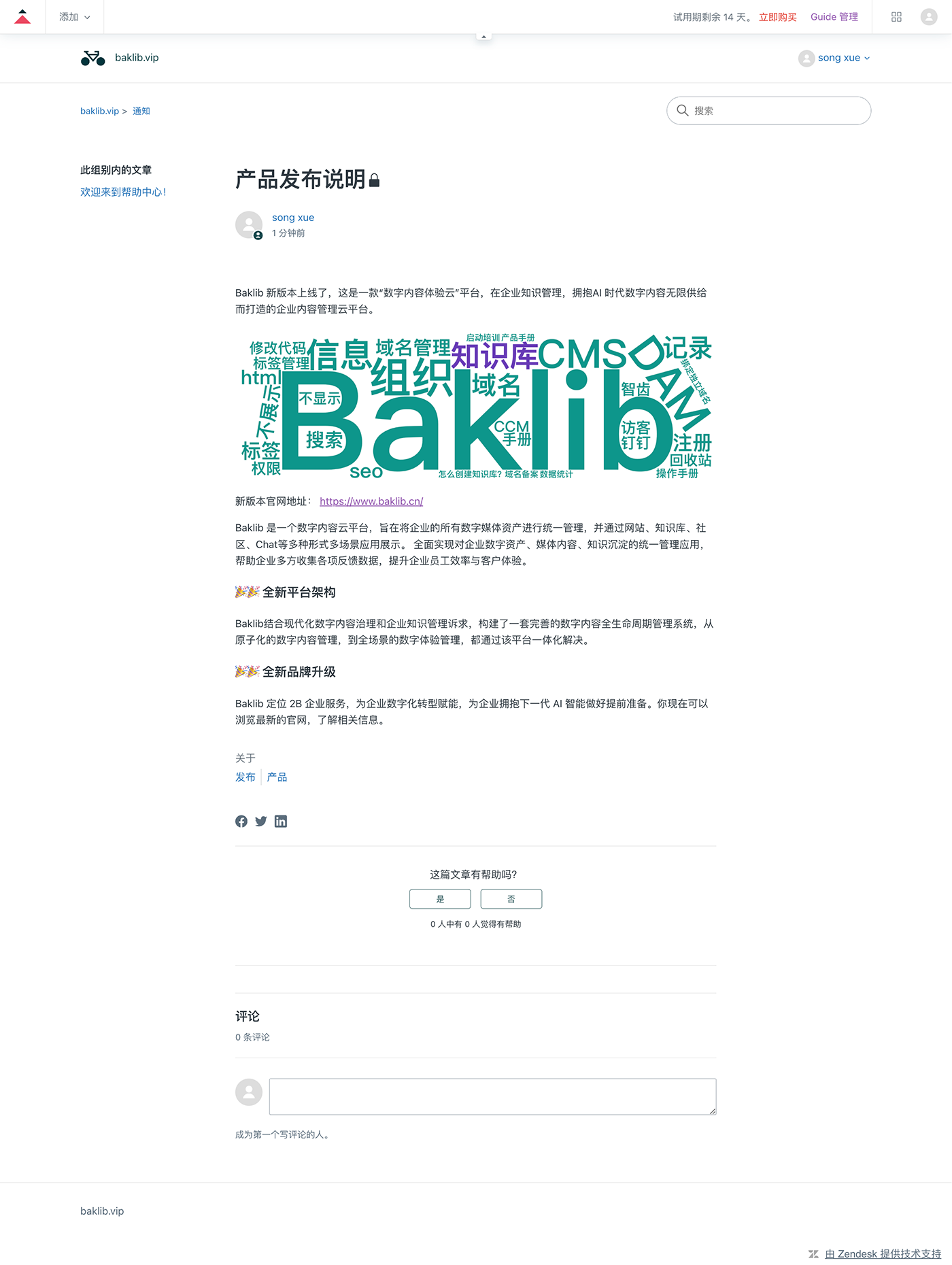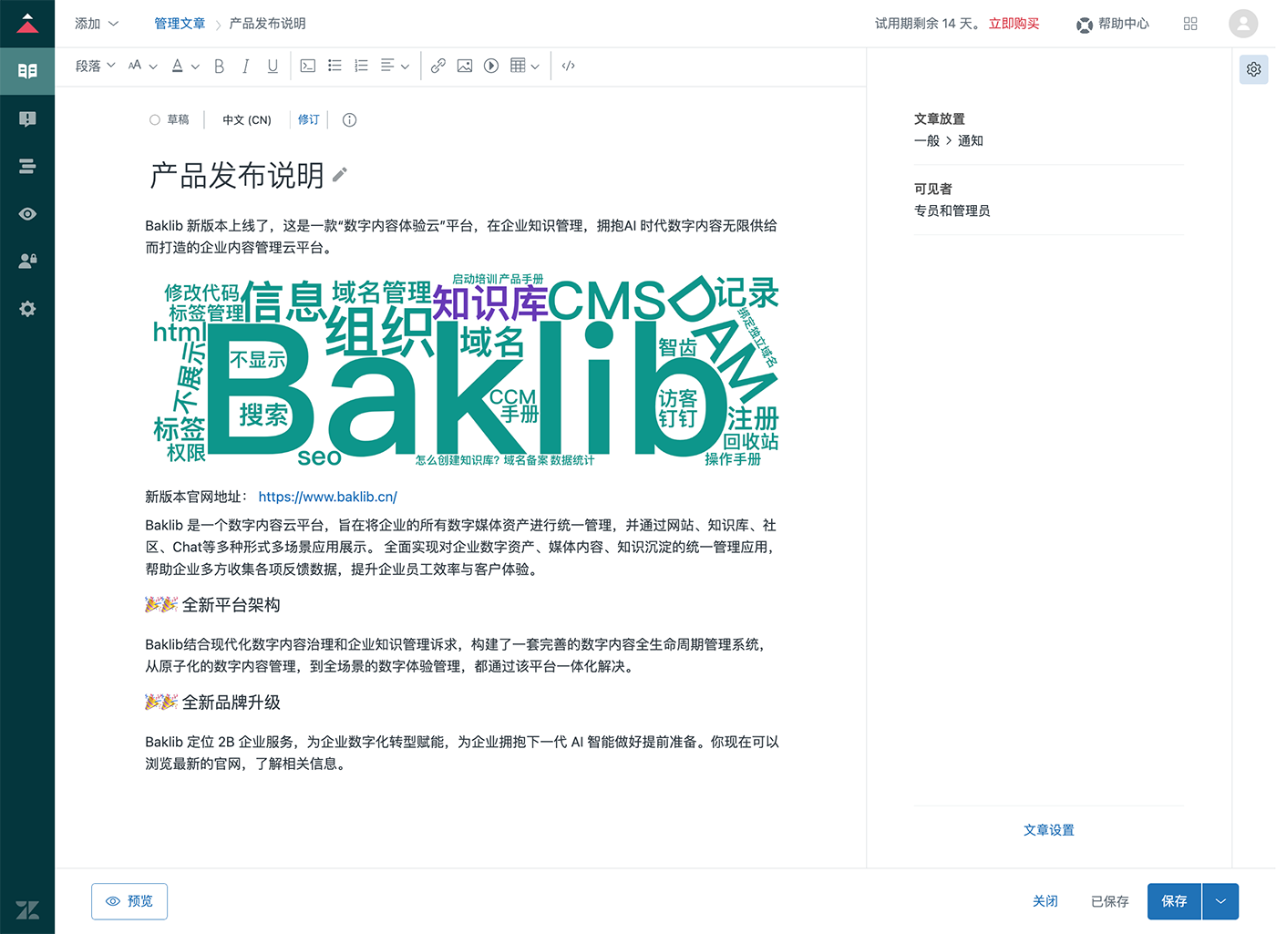 关于文章的预览,Zendesk是提供了一个专门的预览环境,而Baklib是直接到前端真实环境还原最终状态。