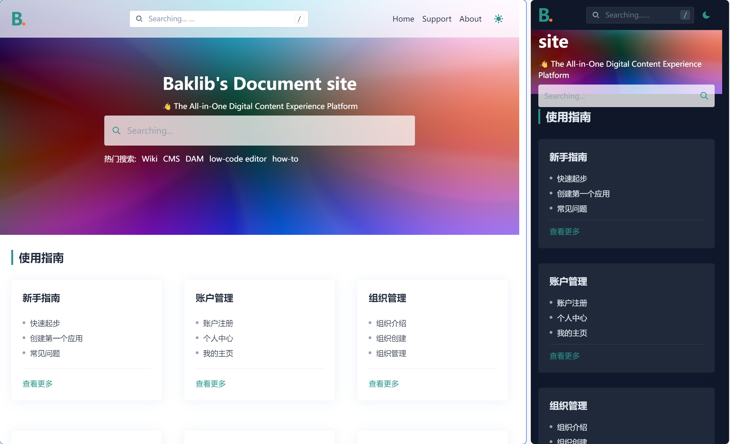 通过默认主题制作的Guide网站页面预览。总体来说两者结构都差不多,满足一个客户帮助中心的大部分使用场景。但作者经过代码研究发现, Zendesk的前端代码沿用了自 2007 年推出以来的过时的JS/CSS库,虽然不影响产品体验,但二次开发会带来不便,以及适配现代多种终端自适应方面略显不足,Baklib因为采用更新的技术栈,在产品自适应方面、可维护方面都表现更优。