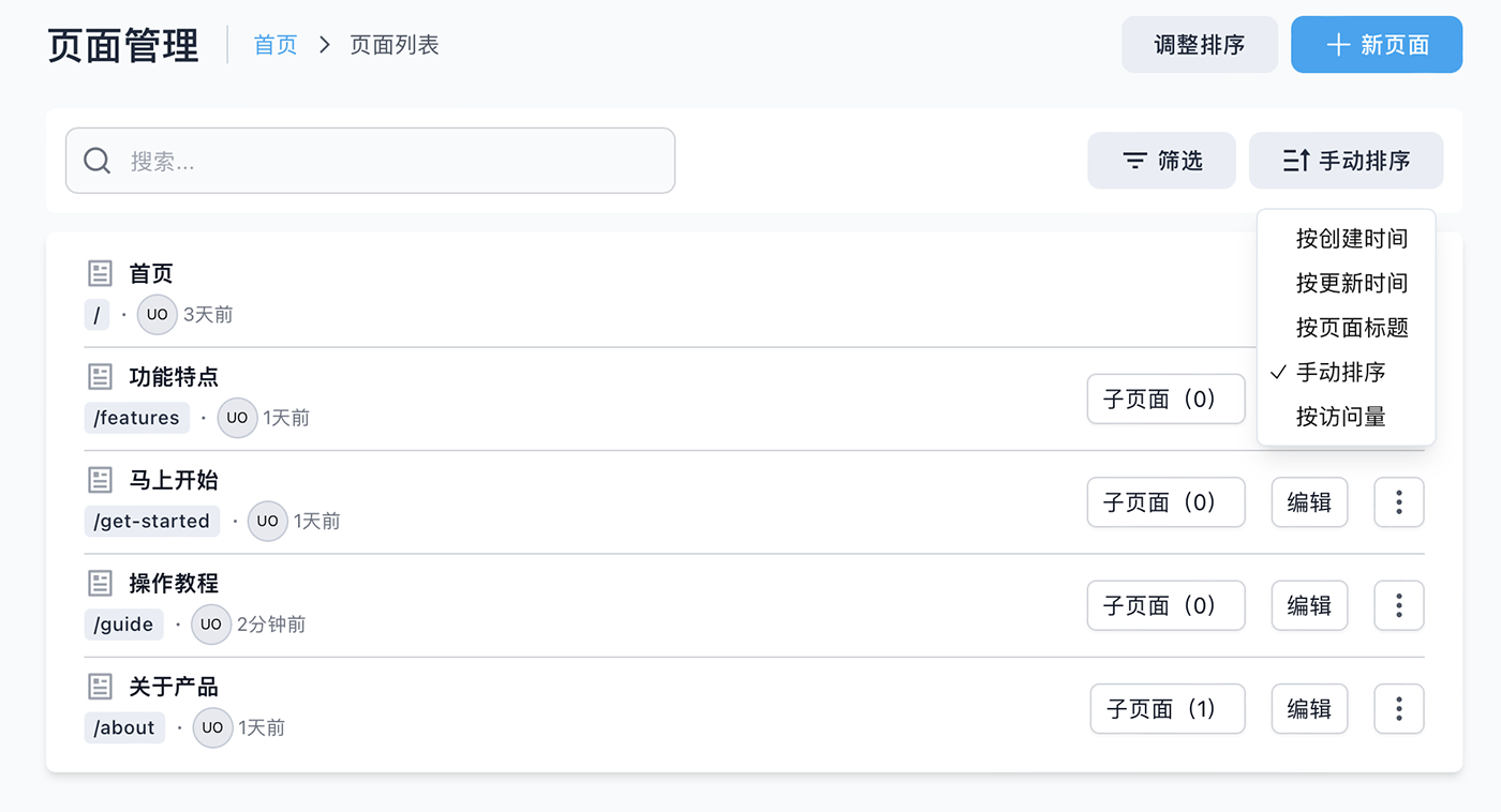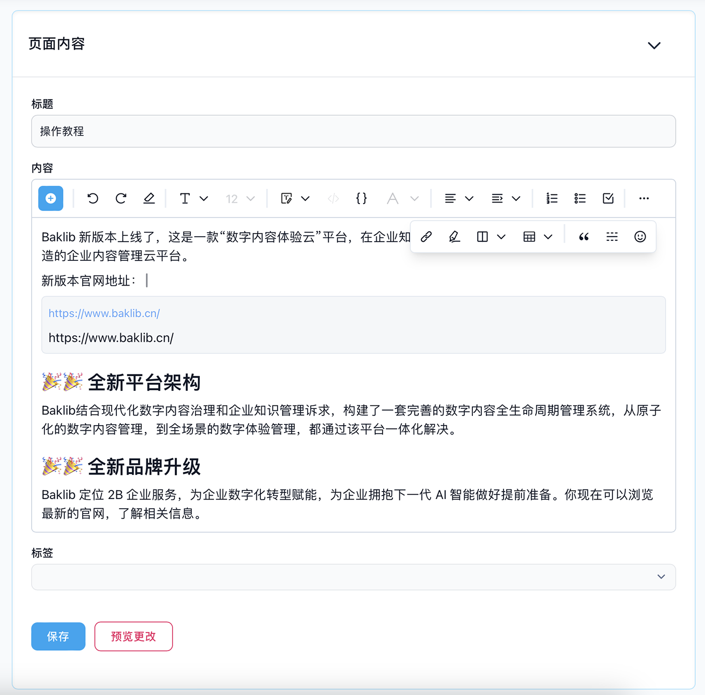 Baklib则只有【页面】一个属性,而通过嵌套层级关系、标签来分类和分组。减少了客户的理解难度。