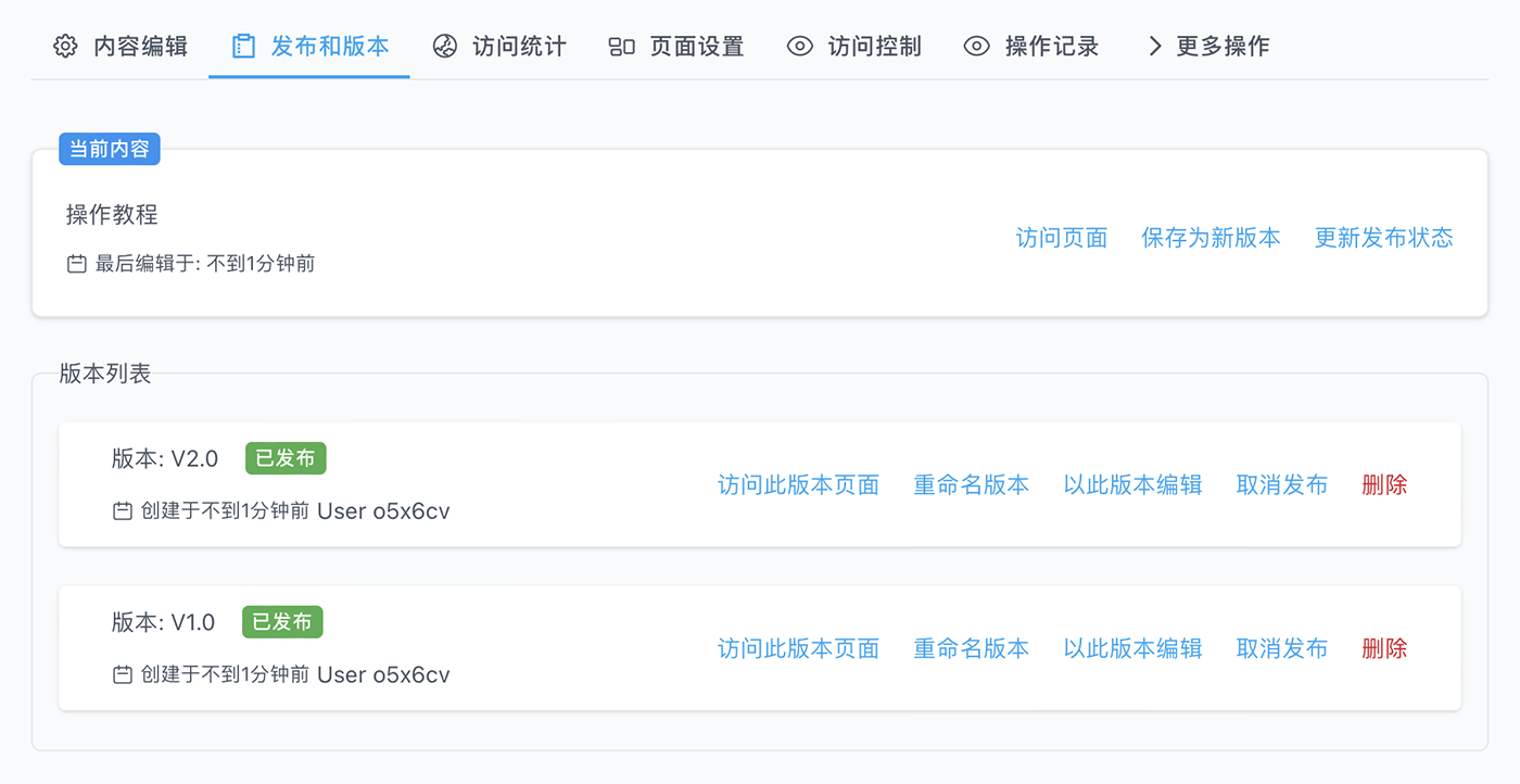 Baklib 的单篇文章支持多版本发布。用户可以在前端遍历{{page.versions}}查看所有已发布的版本。