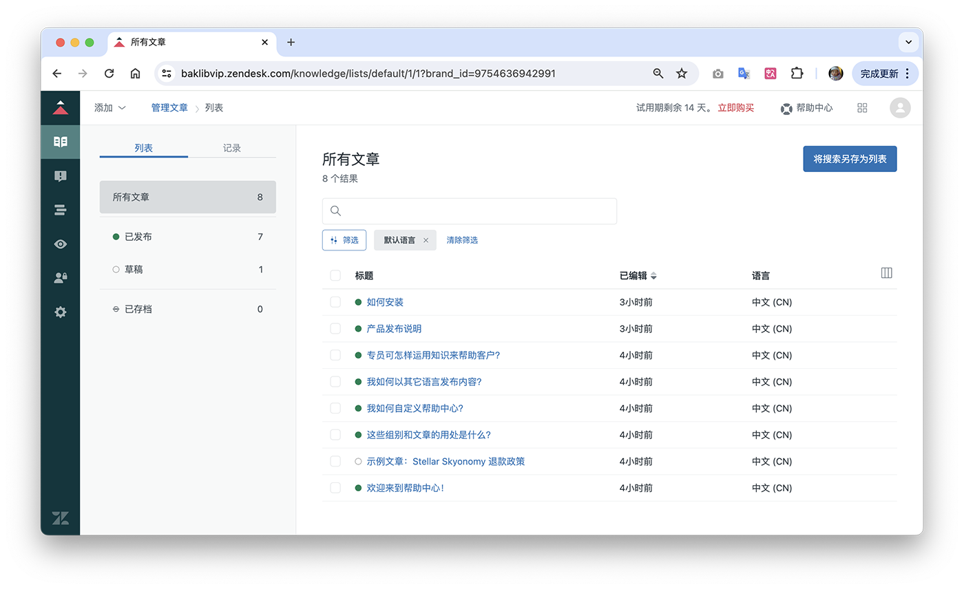 在后台的页面列表管理中,Baklib和Zendesk的设计逻辑有所区别: