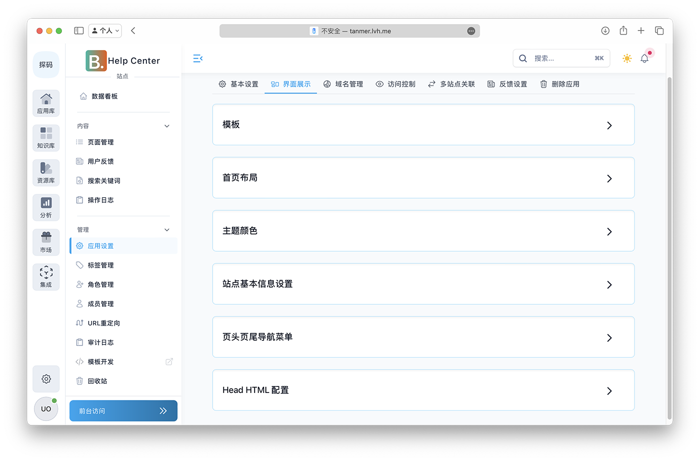 相比Zendesk,Baklib提供了更加丰富的站点设置,以满足更复杂场景的定制化需求。除了域名管理、访问控制、用户反馈、安全设置等共同项外,Baklib独有的设置项有: