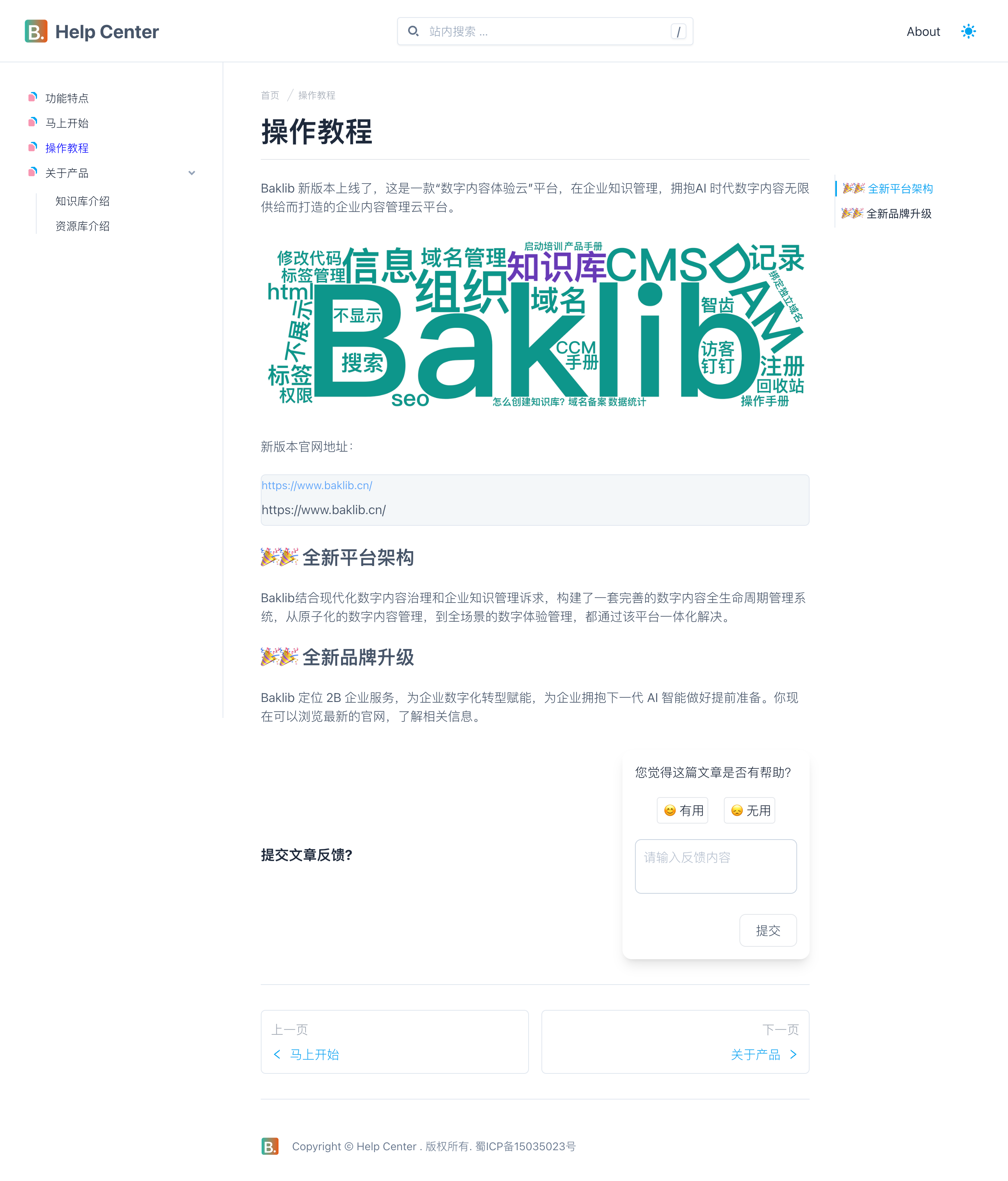 Baklib是All-in-one 数字内容体验管理平台,第一代产品上线于 2018 年,第二代产品于 2024 年推出,采用全新的产品设计理念,以满足企业对 AI 大模型的热衷,对数字化转型后半场期待。Baklib为组织提供了一套综合工具,通过构建品牌网站、产品网页、知识库、博客、文库、网页插件等方式,与客户、潜在客户、合作伙伴、员工和其他受众产生体验交互,并培养有意义的关系。