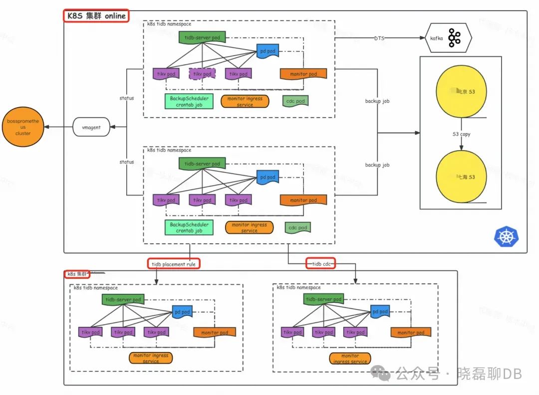 从结构上看,上方 K8s 集群 online 代表当前老机房的 TiDB 集群部署,里面包含了 TiDB 集群的各个组件。下方是新建立一套 k8s 集群,里面也部署了 TiDB 集群;
