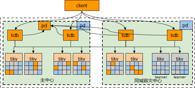 中间 2 个红框代表的同步链路,一个是基于 TiDB placement-rule 副本投放,从视图上还是同一套 TiDB 集群的迁移链路。另外一个是由 TiCDC 同步的上下游 2 套不同的 TiDB 集群(上下游的版本可以不一样)。