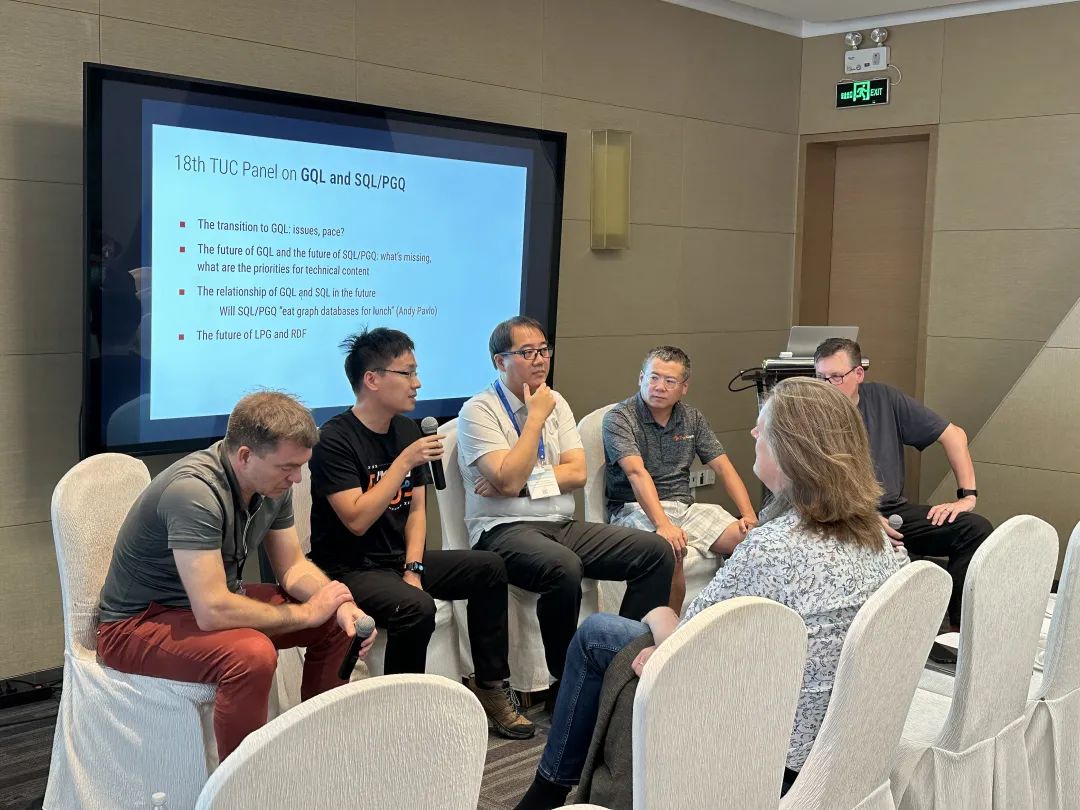 在GQL Session的圆桌讨论环节,由LDBC副主席Alastair Green主持,圆桌讨论嘉宾包括ACM Fellow、LDBC主席、荷兰国家数学与计算机科学研究中心教授Peter Boncz,蚂蚁图计算产品影响力负责人林恒,TigerGraph高级副总裁Mingxi Wu,NebulaGraph高级技术专家程训焘。讨论内容包括从其他查询语言迁移到GQL过程中的问题与节奏、GQL以及SQL/PGQ的内容生态、未来GQL与SQL的关系、RDF与LPG的关系。