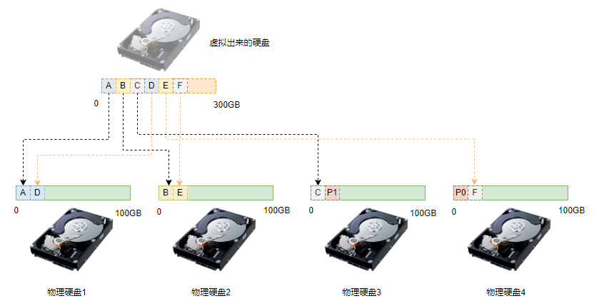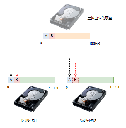 如下图是一个由3块物理硬盘构成的一个RAID0,物理硬盘的容量是100GB,构成的虚拟硬盘的容量是300GB,也就是三个物理硬盘容量之和。虚拟硬盘数据与物理硬盘数据对应关系如下图所示。假设一个数据块大小为一个扇区,那么虚拟硬盘第一个扇区A在第一个物理硬盘的第一个扇区,而虚拟硬盘第二个扇区B则在第二块物理硬盘的第一个扇区,以此类推。