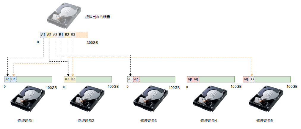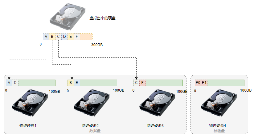 如上图是5块硬盘构成的RAID6的数据布局情况。关于RAID5和RAID6,我们后面会详细介绍,这里就不再赘述了。