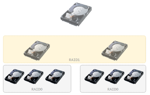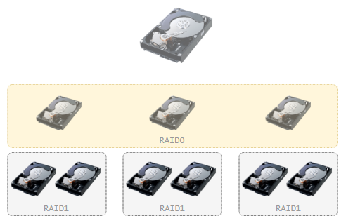上面介绍了最基本的RAID等级。在具体实现的时候可以实现RAID等级的层叠,比如先构建一组RAID1,然后将多个RAID1再构建为一个RAID0。这样构建的设备既具备了RAID1的可靠性,由具备了RAID0的高性能和高容量。