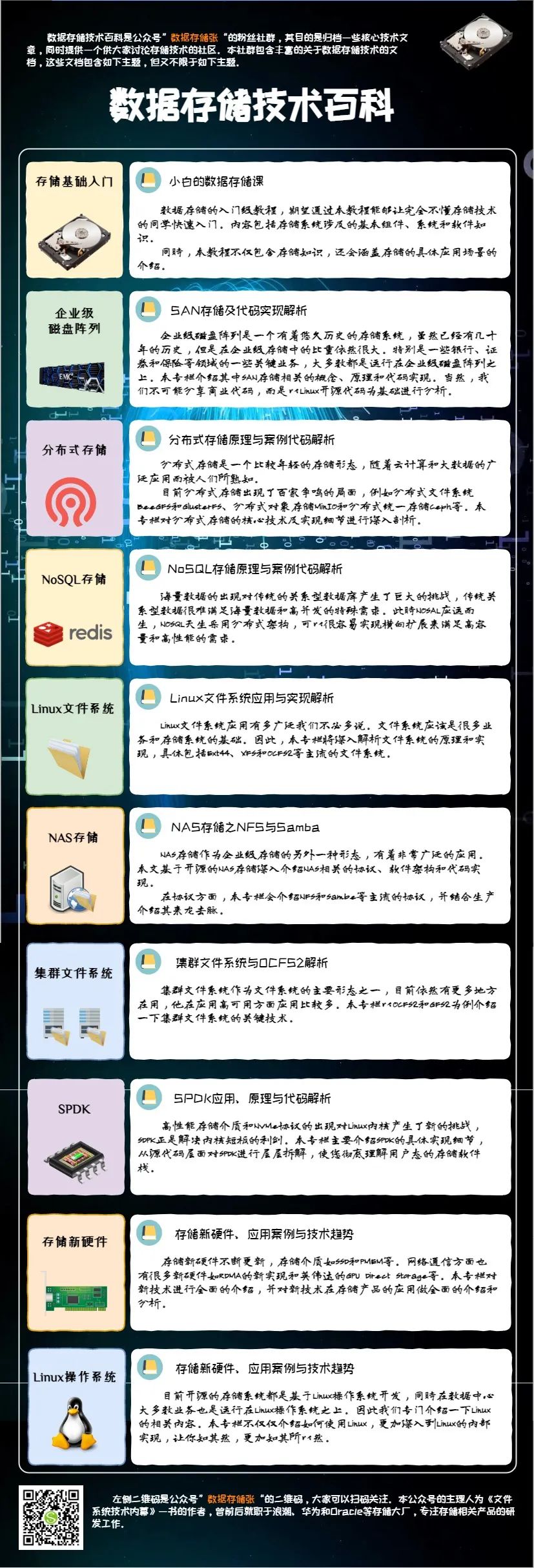 计算机数据存储简史,从纸到云的变迁 基于Fuse的最简单的文件系统 代码覆盖率测试,聊聊gcov和lcov SAN存储的概念与基于iSCSI的操作实战 全面了解SSD,SSD关键术语全面解析 分布式虚拟文件系统,数据编排小能手 高性能的基础RAID0,实操与代码实现解析 网络文件系统,年近五十岁,老当益壮 弹性空间之道,逻辑卷管理(LVM)技术 计算机数据存储简史,从纸到云的变迁 基于树莓派和硬盘柜搭建一个几十TB的家用NAS Linux存储软件栈到底有多复杂,存储软件栈全景概览 分布式存储的软件架构与案例解析 数万客户端NFS服务的困境,聊聊自动挂载技术 深入了解一下SSD的相关内容 什么是文件系统,以Linux中的Ext4为例细聊一下 对象存储,从单机到分布式的演进 为什么都说NFS读写性能差,如何进行优化?