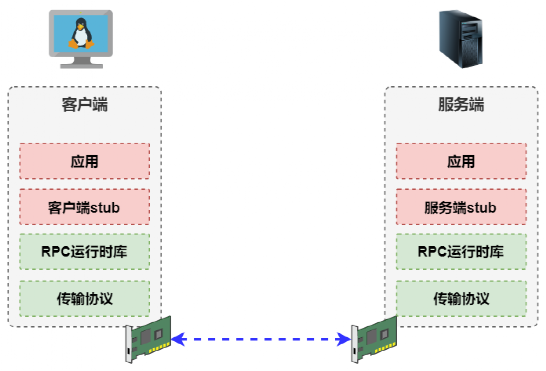 对于基于RPC协议的服务如下图,通常包括RPC运行库、客户端/服务端存根(stub)和实现业务的应用程序。