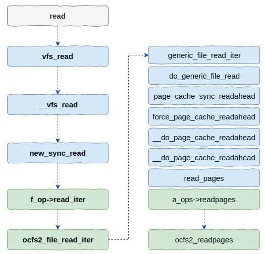 上图中read函数是用户态的API函数。然后蓝色方块中的函数是VFS(虚拟文件系统)中的函数。最后绿色方块中的函数则是具体文件系统的函数,本文为OCFS2文件系统中的函数。可以看到,VFS和OCFS2之间存在交叉调用的情况。