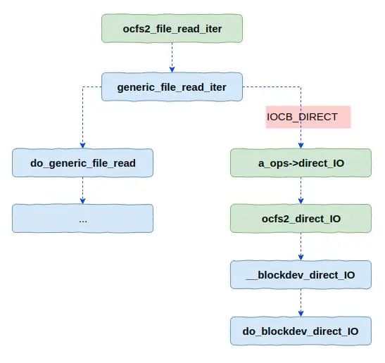 上图中ocfs2_file_read_iter函数是OCFS2文件系统读数据的入口函数,所有的读请求都要经过该函数。在该函数内部会调用VFS的generic_file_read_iter函数,而该函数根据文件的属性有不同的流程,具体如图所示。