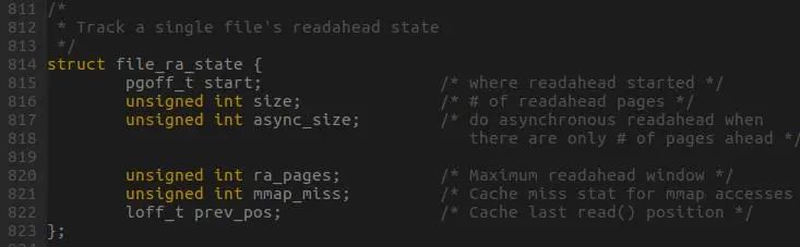 预读算法的涉及的结构体(file_ra_state)如图所示,该结构体是file结构体的成员。从结构体之间的关系我们可以意识到,预读是以文件为单位进行的。该结构体各个成员的含义请参考图中英文注释。