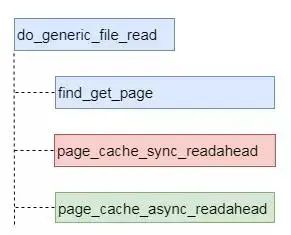 其实所有文件都使用的VFS的公共特性来实现预读。如图1所示,同步预读和异步预读的起始逻辑在函数do_generic_file_read中。其中find_get_page用于查找是否有缓存并返回找到的缓存页。如果没有找到缓存页则运行红色方框的流程,进行同步预读。如果找到缓存页,并且该缓存页有预读标记则运行绿色方框的流程,进行异步预读。