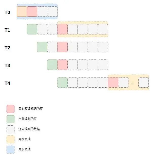 为了更加清楚的理解上述过程,我们通过如图所示的图像来解释同步预读与异步预读整个过程。其中T0-T4表示时间轴。不同颜色的方块代表不同状态的页。