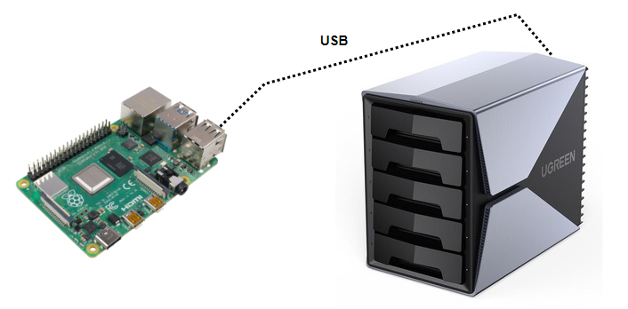 今天,我们就介绍一下如何用树莓派和一个硬盘柜搭建一个有几十TB容量的家用存储系统,我们称为家用NAS。当然,如果您银子足够,而且对技术没什么兴趣,可以直接买一个成熟的NAS产品,网上很多介绍,本文不再赘述。整个硬件架构是比较简单的,一个树莓派主板加上一个硬盘柜,两者用USB线相连接。