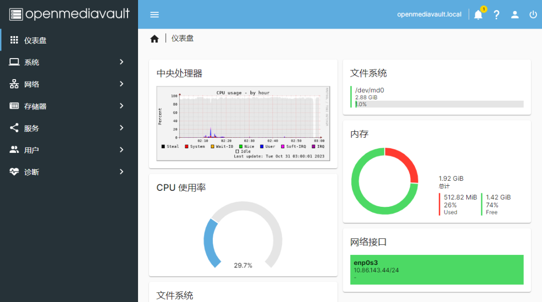 安装成功后可以通过Web登录系统了,下图是配置好的仪表盘页面,如果是新系统可能略有不同。主要功能集中在左侧的导航栏中,我们主要关注跟存储相关的内容,涉及导航栏中的存储器和服务两个选项卡中的内容。