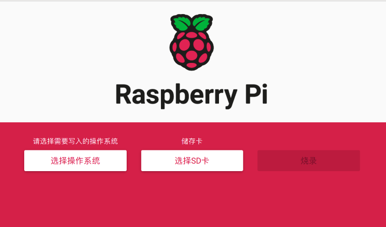 树莓派的操作系统是安装在一个SD卡上的,因此我们首先需要下载一个烧录工具,这里选择树莓派官方的烧录工具(也可以用etcher)。软件启动后的界面如下图所示(不同版本界面略有不同,请注意版本号),可以看到有3个按钮,分别是操作系统镜像按钮,SD卡选择按钮和烧录按钮。
