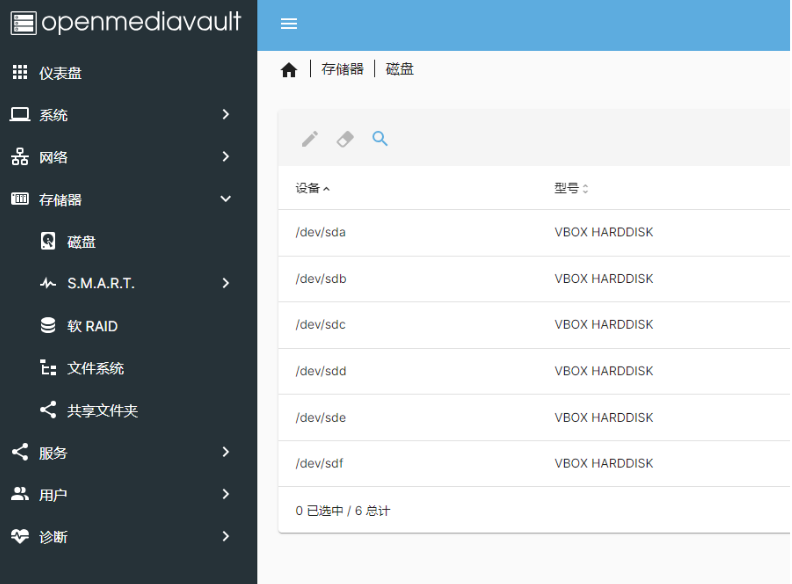 点击“存储器”可以打开该选项卡,可以看到其中包含磁盘、SMART、软RAID、文件系统和共享文件系统等子选项卡。当点击“磁盘”时可以看到该系统中的所有硬盘,我们这里一共有6块硬盘,具体如下图所示。