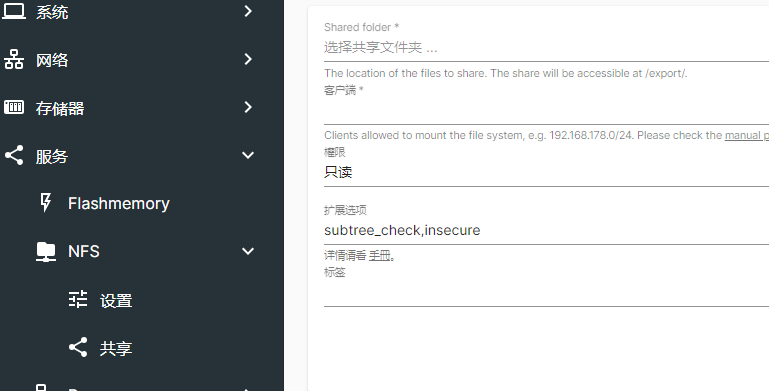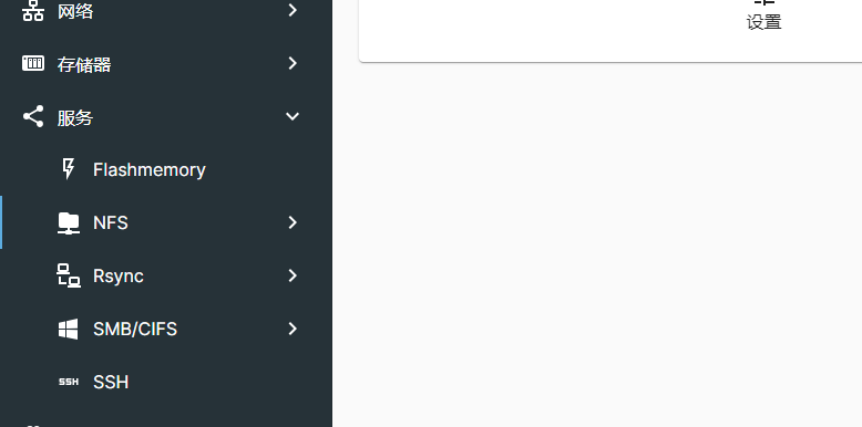 经过上述几步后,我们创建的可以导出的存储资源。接下来需要启动服务,以NFS服务为例,包含两个设置项,分别为“设置”和“共享”。其中“设置”用于配置启动的NFS服务类型。“共享”则是用于将前面创建共享目录导出,如果大家熟悉Linux的NFS的话,其实这一步就是在/etc/exports文件中添加一个配置项。