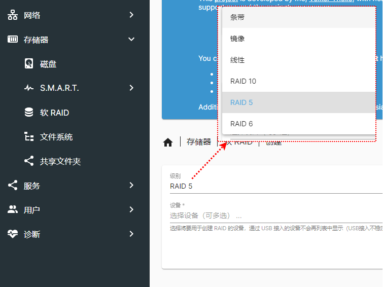 对于存储资源,最底层的是单块的硬盘,然后通过软RAID可以将多块硬盘打包成一个虚拟的硬盘,这个虚拟的硬盘通过RAID算法可以保证数据的可靠性(前文已述相关内容)。另外,必需在这个虚拟硬盘上创建文件系统才能被NFS或者SMB服务导出。首先我们需要基于硬盘构建RAID,点击“软RAID”标签后可以看到一个创建按钮(加号),然后会出现一个向导,我们只需要按照向导操作即可。如下所示,这里RAID有很多类型,可以按需选择。