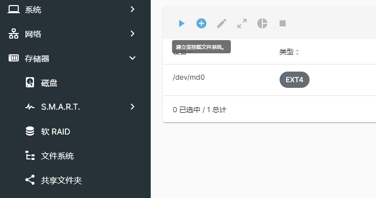 完成RAID创建后,我们需要在这个RAID上创建文件系统。点击“文件系统”标签可以看到相关的功能按钮如下图所示。点击“加号”可以出现一个创建文件系统的向导,按照向导操作即可,比较简单,本文不再赘述。