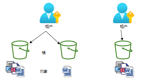 回到对象存储,我们介绍一下对象存储涉及的基本概念。由于对象存储是一个云产品,在一个存储系统中通常会有非常多的用户使用,一个用户可以创建不同的桶用于不同的用途。因此,在一个对象存储系统中各个元素之间的概念如图所示。