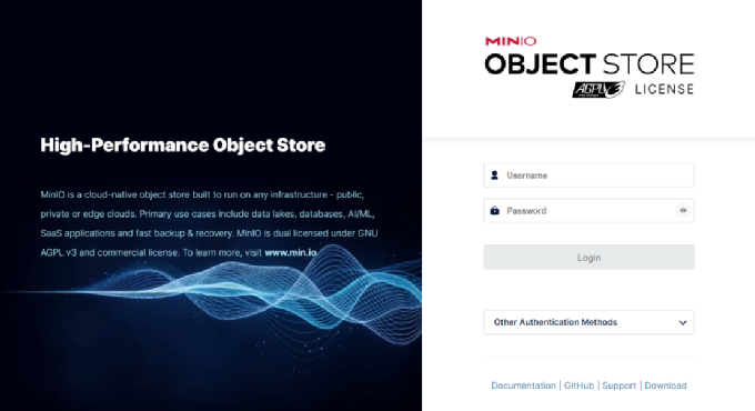 基于上述IP地址信息,我们可以通过浏览器登录Minio。如下是其登录页面,输入用户名和密码后就可以登录。可以看到Minio做的还是比较不错的,界面也还算炫酷。