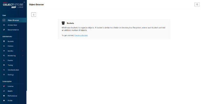 登录后的界面如下所示,其中左侧是导航栏。由于整个存储系统没有任何数据,首页有个提示创建桶(Bucket)的提示。根据前面介绍,对象存储中桶是一个容器,对象是存储在某一个桶中的。因此,我们需要首先创建一个桶。