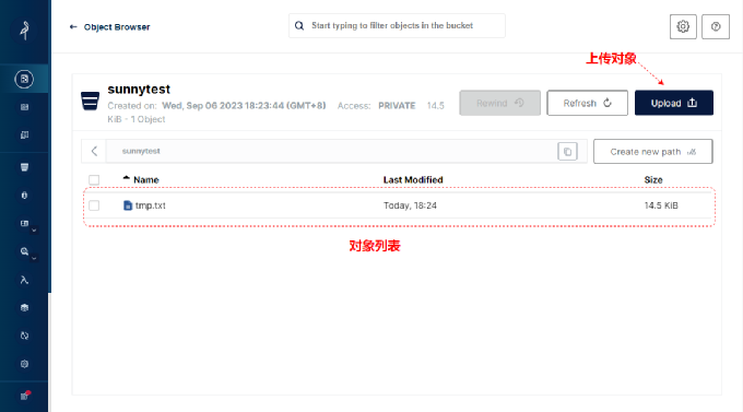 我们这里创建了一个名称为sunnytest的桶,并上传了一个名称为tmp.txt的对象。这个对象就本地的一个文本文件。经过上述操作后,可以看到此时的界面变成了下图的样子。在下图中,我们可以看到这里有一个创建对象的按钮(“Upload”)。当单击这个按钮的时候会弹出一个文件浏览的对话框,我们可以选择需要上传的文件。如果桶中有对象,对象会以列表的方式在这里展示。